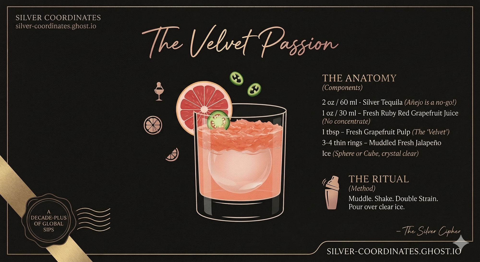 The Velvet Passion is my "Control Group." When I sit at a bar in Frankfurt, Palo Alto, Jakarta or Dubai, I am looking for this level of balance. If a lead bartender cannot handle the friction of a chili or the bitterness of a grapefruit with grace, they are not ready for the map.